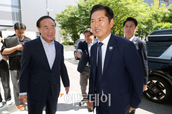 ▲정청래(오른쪽) 더불어민주당 대표가 10일 경기 삼성전자 평택캠퍼스를 방문해 전영현 삼성전자 디바이스솔루션(DS)부문장(부회장)의 안내를 받으며 반도체산업 발전을 위한 현장 간담회장으로 향하고 있다. 국회사진기자단