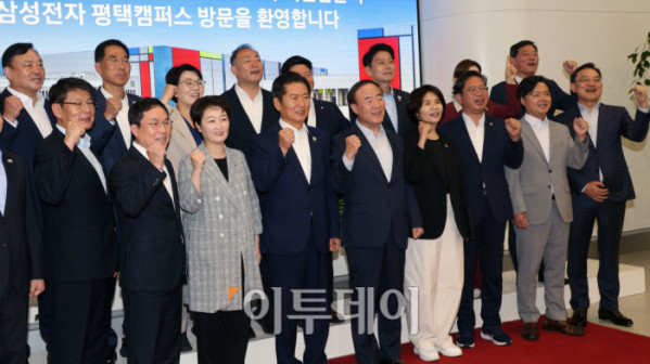 ▲정청래(앞줄 왼쪽 네번째) 더불어민주당 대표가 10일 경기 삼성전자 평택캠퍼스에서 열린 반도체산업 발전을 위한 현장 간담회에서 전영현(앞줄 가운데) 삼성전자 디바이스솔루션(DS)부문장(부회장)을 비롯한 참석자들과 기념촬영을 하고 있다. 국회사진기자단