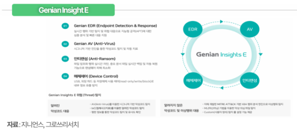 한 연구원은 "동사는 새로운 백신 솔루션을 출시하면서 엔드포인트 제품군을 'Genian Insight E'라는 브랜드명으로 재편하면서 엔드포인트 탐지 및 대응(EDR), 백신, 안티랜섬, 매체제어로 구성돼 PC 등 엔드포인트 보안을 총괄하는 솔루션을 제공한다"라며 "재편을 통해 이러한 예산 구조의 장벽을 완화하고, EDR 고객사 확장을 위한 전략적 기회가 열릴 것으로 기대한다"라고 밝혔다.