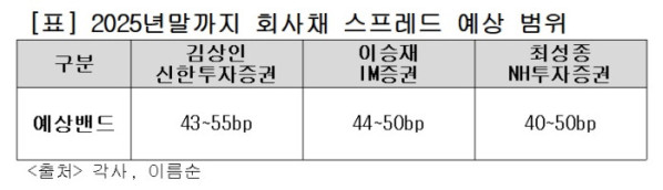 이승재 애널리스트는 “상반기부터 스프레드 축소세가 가팔랐던데다, 4분기부터 연말까지 기관투자자들은 포트폴리오 리밸런싱과 북클로징을 함에 따라 스프레드는 오히려 확대되는 추세를 보일 수 있다”고 전했다. 김상인 애널리스트도 “이르면 9월부터 기관들이 북클로징에 들어갈 것으로 보여 스프레드 추가 축소는 제한적일 것으로 보인다. 주식이 더 오르더라도 (회사채 스프레드는) 9월을 기점으로 10월부터 확대 압력이 우세할 것”이라고 말했다.