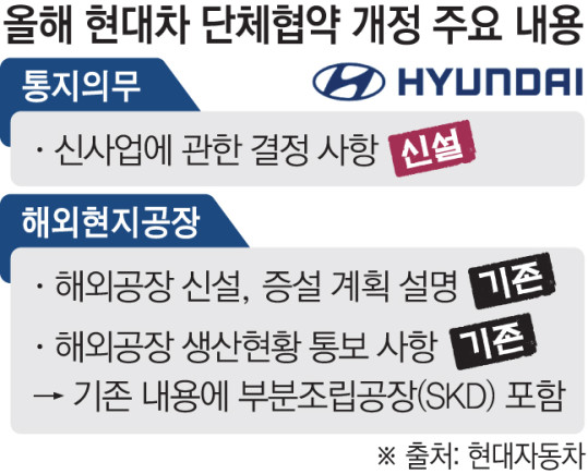 11일 완성차 업계에 따르면 현대차 노사는 올해 임금 및 단체협약(임단협) 잠정합의안에 ‘신사업에 관한 결정 사항을 통지하는 것을 의무화’하는 내용을 담았다. 또 기존 해외 공장 신설·생산현황을 공유해왔던 조항에 부분조립생산(SKD) 공장도 포함하는 것으로 범위를 넓혔다.