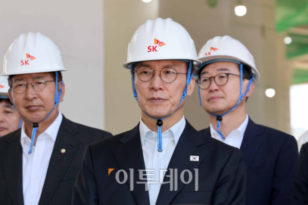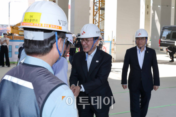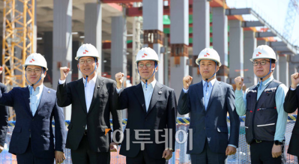▲김민석(가운데) 국무총리가 11일 경기 용인시 처인구 용인 반도체 클러스터 공사현장에서 곽노정 SK하이닉스 대표 등 관계자들과 기념촬영을 하고 있다. 청사사진기자단