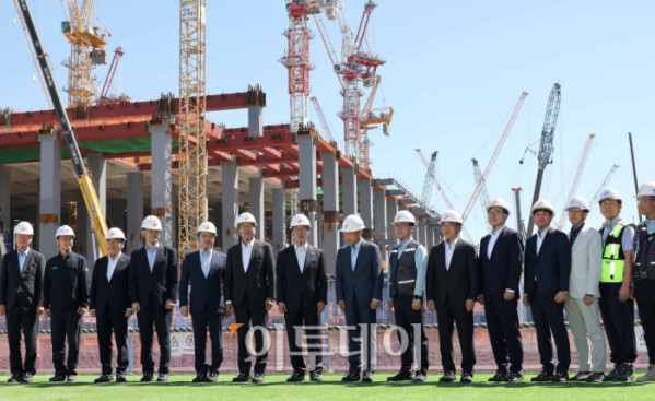 ▲김민석(왼쪽 일곱 번째) 국무총리가 11일 경기 용인시 처인구 용인 반도체 클러스터 공사현장에서 곽노정 SK하이닉스 대표 등 관계자들과 기념촬영을 마친 후 이동하고 있다. 청사사진기자단