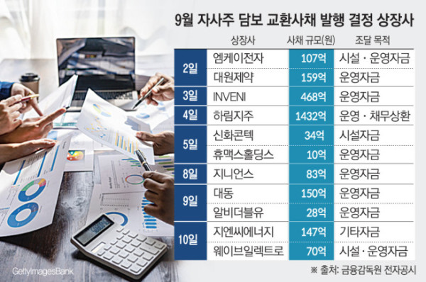 9월 들어 자사주를 담보로 하는 교환사채(EB) 발행에 나서는 상장사들이 급증하고 있다.