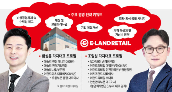 14일 이랜드리테일에 따르면 이랜드리테일은 작년 말부터 황성윤 대표와 조일성 대표 2인의 각자대표 체제로 운영되고 있다. 부문별로는 황성윤 대표가 외식업과 유통 시너지 강화를 주도하는 영업 및 전략 담당을 맡고, 조일성 대표는 안전관리 부문을 책임지고 있다.