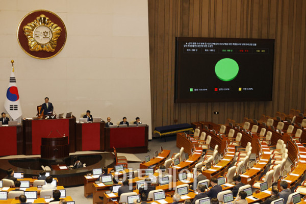 ▲11일 서울 여의도 국회 본회의에서 '김건희와 명태균·건진법사 관련 국정농단 및 불법 선거 개입 사건 등 진상규명을 위한 특별검사 임명 등에 관한 법률 일부개정법률안에 대한 수정안'이 여당 주도로 통과되고 있다. 고이란 기자 photoeran@