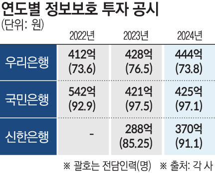 한편 KISA 정보보호공시에 따르면 지난해 국민은행의 정보보호 투자 규모는 전년과 유사한 425억 원, 전담인력은 97명 수준이다. 같은 기간 신한은행은 370억 원을 투입하고 인력을 85명에서 91명으로 늘렸다. 우리은행은 444억 원을 투자해 73.8명의 인력을 보유 중이다.
