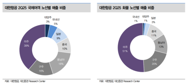 양 연구원은 "3분기 별도 기준 매출액은 전년 대비 1.5% 하락한 4조1800억 원(국제 여객 매출액 2조4000억 원, 항공화물 매출액 1조1000억 원)을 기록할 것으로 전망하는데, 국제선 여객 노선 중 미주노선은 트럼프 행정부의 이민자 규제 영향으로 유학생 및 친지방문 등 인바운드 수요 감소 영향 등이 있었을 것으로 예상한다"라며 "항공화물의 경우 미국의 800달러 이하 제품에 대한 관세 부과에도 전자상거래(E-Commerce) 수요에 미치는 영향은 아직은 미미한 것으로 보인다"라고 밝혔다.