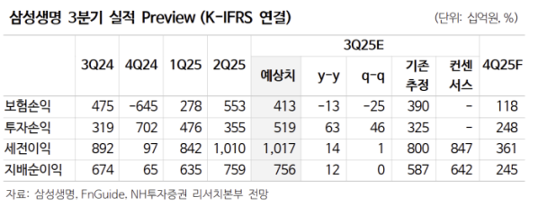 삼성생명 3분기 지배순이익은 7564억 원으로 예상됐다. 고마진 건강보험 판매 확대로 양호한 신계약이 예상되고 일회성 부동산 매각이익이 발생한 영향이다.
