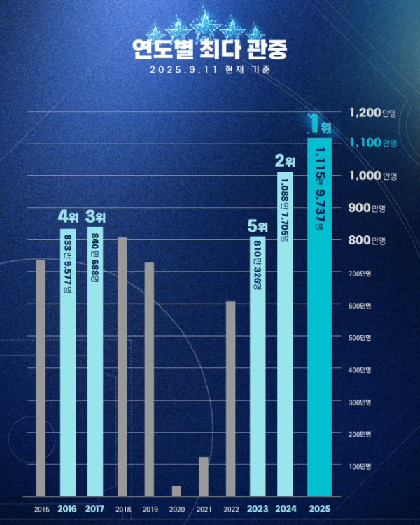 이후 2023년 5년 만에 800만 관중을 회복했고, 2024년 ABS 도입, 온라인상 영상 콘텐츠 제작 허용에 따른 효과 등으로 사상 첫 1천만 관중을 돌파했다. 올해에도 기세를 이어 2년 연속 1천만 관중 달성에 성공했으며, 5일에는 지난 해 기록한 최다 관중 기록을 1년 만에 경신한 바 있다.