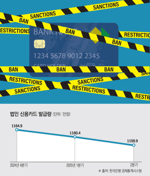 국내 카드사의 법인 신용카드 발급 건수가 22년 만에 처음으로 2분기 연속 감소했다. 경기 둔화와 통상 리스크 속에서 기업들이 투자와 영업을 최소화하면서 법인카드 발급과 이용 건수까지 위축되는 모습이다.