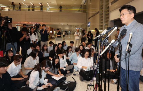 ▲미국 이민당국에 의해 조지아주에 구금됐던 한국인 근로자들과 함께 귀국한 김동명 LG에너지솔루션 사장이 12일 인천국제공항 제2터미널 입국장에서 취재진 질문에 답하고 있다. 신태현 기자 holjjak@