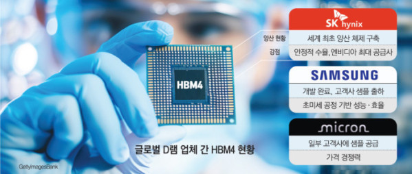 글로벌 인공지능(AI) 열풍을 이끄는 차세대 고대역폭 메모리 ‘HBM4’ 시장의 막이 올랐다. SK하이닉스가 세계 최초로 양산 체제를 갖추며 선제공격에 나섰고, 삼성전자는 초미세 공정 조합을 앞세워 반격 채비를 마쳤다. 미국 마이크론과 중국 반도체 기업들이 뒤처진 가운데 한국 양대 반도체 기업이 세계 시장의 주도권을 쥘 수 있다는 전망이 나온다.