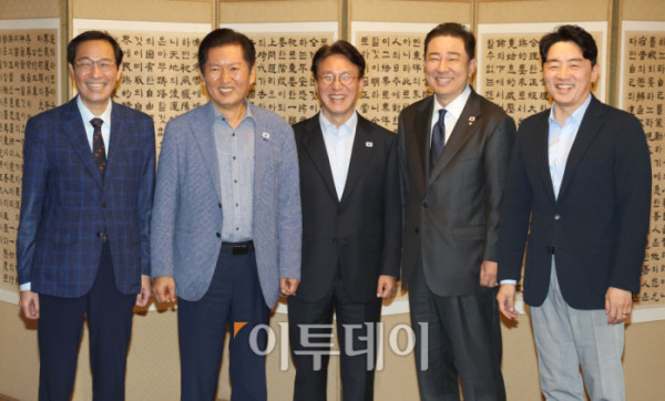 ▲우상호(왼쪽부터) 정무수석, 정청래 더불어민주당 대표, 김민석 국무총리, 김병기 원내대표, 강훈식 대통령 비서실장이 14일 서울 종로구 삼청동 국무총리 공관에서 열린 당정대 고위급 만찬 회동에서 기념촬영을 하고 있다. 고이란 기자 photoeran@