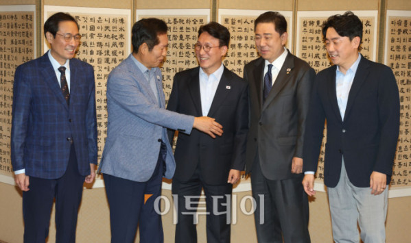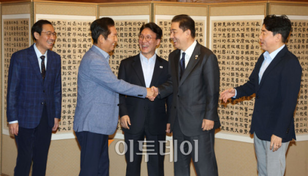 ▲정청래 더불어민주당 대표와 김병기 원내대표가 14일 서울 종로구 삼청동 국무총리 공관에서 열린 당정대 고위급 만찬 회동에서 기념촬영을 마친 후 손을 잡고 있다. 왼쪽부터 우상호 정무수석, 김민석 국무총리, 정 대표, 김 원내대표, 강훈식 대통령 비서실장. 고이란 기자 photoeran@