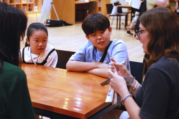 ▲7월 19일 경기도 파주 '지혜의 숲'에서 진행된 '영어 동화작가 되기 원데이클래스'에서 체험단 참가자들이 원어민 선생님이 진행하는 스토리텔링 수업을 듣고 있다. (사진제공=웅진그룹)