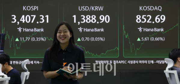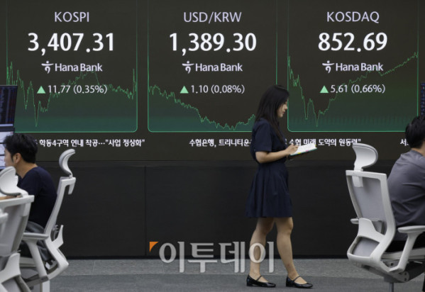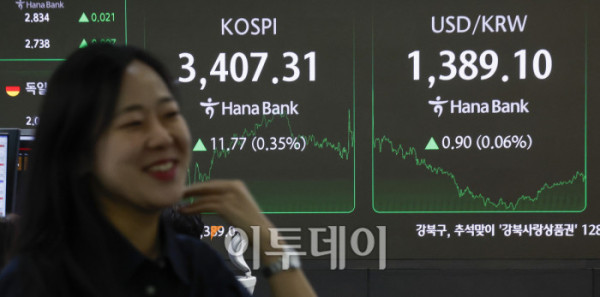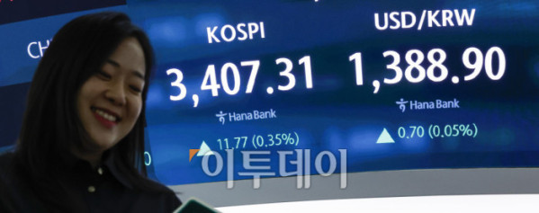 ▲코스피가 사상 첫 3400선을 돌파한 15일 서울 중구 하나은행 딜링룸 전광판에 코스피, 코스닥, 원·달러 환율이 표시돼 있다. 이날 코스피 지수는 전 거래일보다 11.77(0.35%)포인트 상승한 3407.31을 코스닥은 5.61(0.66%) 포인트 상승한 852.69를 나타냈다. 이날 코스피 지수는 장중 3420.23으로 4거래일 연속 사상 최고치를 기록했다. 원·달러 환율은 종가 기준 1389.30원을 나타냈다. 조현호 기자 hyunho@