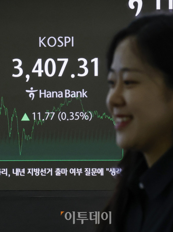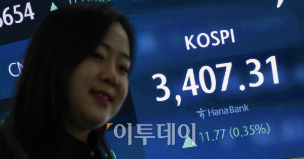 ▲코스피가 사상 첫 3400선을 돌파한 15일 서울 중구 하나은행 딜링룸 전광판에 코스피가 표시돼 있다. 이날 코스피 지수는 전 거래일보다 11.77(0.35%)포인트 상승한 3407.31을 나타냈다. 이날 코스피 지수는 장중 3420.23으로 4거래일 연속 사상 최고치를 기록했다. 조현호 기자 hyunho@