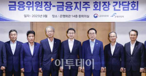 이억원(오른쪽 다섯 번째) 금융위원회 위원장이 15일 서울 중구 은행연합회에서 열린 금융위원장-금융지주 회장 간담회에서 금융지주 회장들과 기념촬영을 하고 있다. 조현호 기자 hyunho@