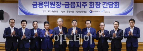 ▲이억원(오른쪽 다섯 번째) 금융위원회 위원장이 15일 서울 중구 은행연합회에서 열린 금융위원장-금융지주 회장 간담회에서 금융지주 회장들과 기념촬영을 하고 있다. 조현호 기자 hyunho@