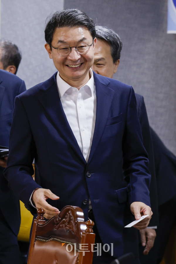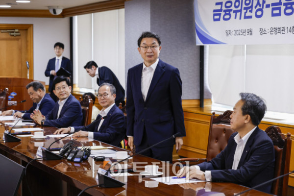 ▲이억원 금융위원회 위원장이 15일 서울 중구 은행연합회에서 열린 금융위원장-금융지주 회장 간담회에서 참석자들에게 인사를 하고 있다. 조현호 기자 hyunho@