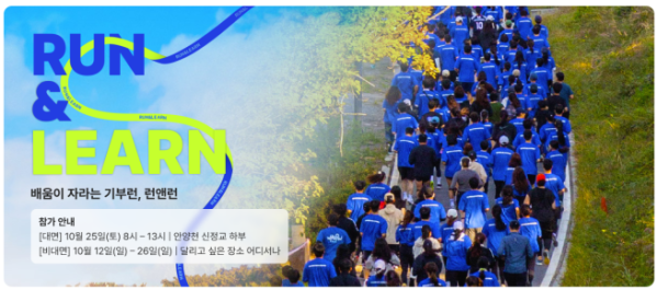 올해 두 번째로 열리는 배움이 자라는 기부런 행사는 다음달 25일 안양천 신정교 하부에서 진행된다. 대면 참가와 비대면 참가로 진행되며 약 2000여 명이 참여한다. 참가비는 전액 교육 취약계층 아동과 청소년 지원에 사용된다.