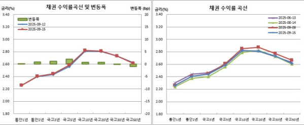 15일 채권시장과 금융투자협회에 따르면 통안2년물은 0.9bp 상승한 2.406%를, 국고3년물은 1.2bp 오른 2.443%를, 국고10년물은 0.8bp 상승해 2.821%를 기록했다. 반면, 국고30년물은 0.1bp 하락한 2.730%를 나타냈다.