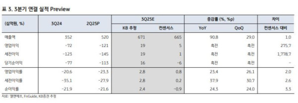 3분기 실적은 매출액 6709억 원, 영업이익 188억 원으로 2년 만의 흑자전환을 기대했다. 이 연구원은 “양극재 판매 가격은 상반기 리튬 가격 하락 영향으로 전분기 대비 5% 하락할 것으로 예상되나 판매량은 테슬라 모델Y 주니퍼 본격 인도 영향으로 NCMA95 출하량이 확대되면서 전분기 대비 38% 증가할 것으로 전망된다”고 말했다.