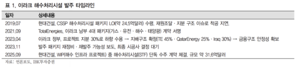조정현 IBK투자증권 연구원은 "현대건설은 전날 이라크 WIP(해수처리시설) 프로젝트 수주를 공시했다"며 "이번 계약은 2019년 혀대건설이 발주처로부터 LOI(낙찰 의향서)를 받았으나, 지분 구조 및 재원 이슈로 지연됐다"고 설명했다.