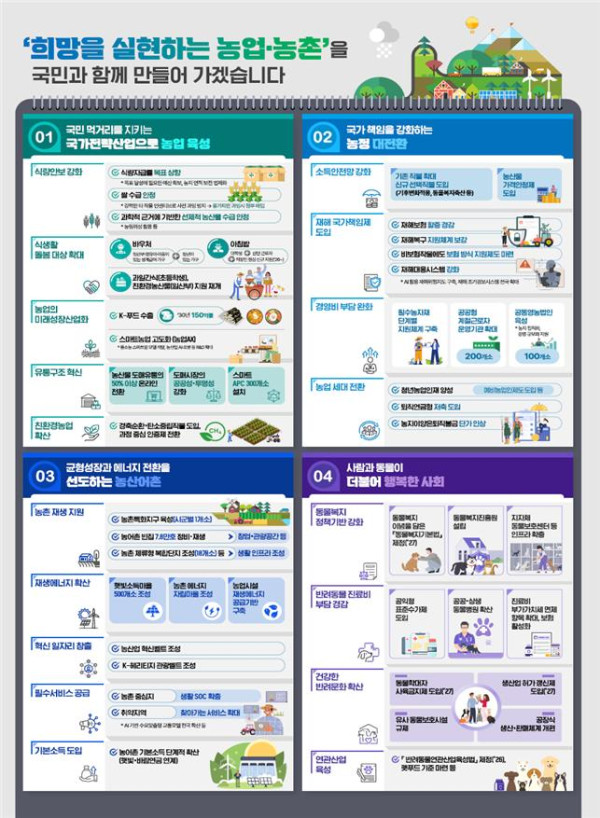 균형성장과 에너지 전환 과제도 주목된다. 농어촌 기본소득을 햇빛·바람연금 등과 연계해 단계적으로 도입하고, 주민 주도의 ‘햇빛소득마을’을 2030년까지 500곳 조성한다. 태양광·바이오가스·지열 등을 활용한 농업시설 재생에너지 자립을 지원해 농업 RE100 기반을 마련한다.