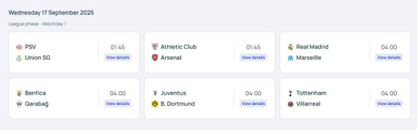 개막일 첫 경기는 오전 1시 45분 네덜란드 에인트호번에서 열린다. PSV 에인트호번은 구단 역사상 첫 챔피언스리그 본선 무대를 밟은 벨기에 위니옹 생질루아즈를 홈으로 불러들인다. PSV는 최근 UEFA 대항전 홈 11경기에서 무패 행진을 이어가고 있으며 위니옹은 지난해 유로파리그에서 네덜란드 팀을 상대로 2전 전승을 기록한 바 있다. 같은 시각 스페인 산 마메스 바리아에서는 아틀레틱 빌바오가 프리미어리그(PL) 강호 아스널을 상대로 본선 복귀전을 치른다. 빌바오는 2014/15시즌 이후 10년 만에 UCL 무대에 복귀했으며, 아스널은 최근 5경기 연속 스페인 팀을 상대로 승리를 기록 중이다.