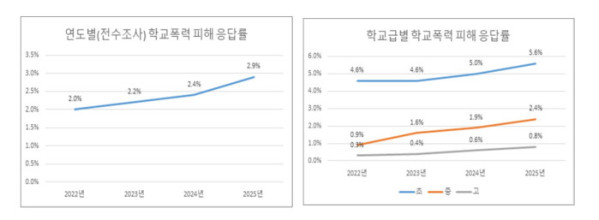 학교폭력 피해를 당했다고 응답한 학생 수는 5년 연속 증가했다. 2021년 1.2%였던 피해응답률은 2022년 2.0%, 2023년 2.2%, 2024년 2.4%, 2025년 2.9%로 늘었다.