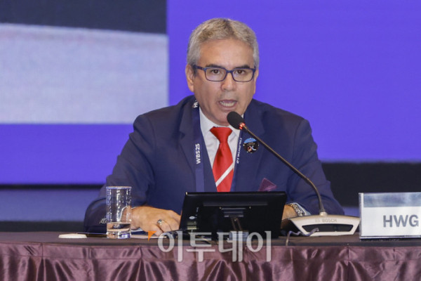 ▲빅터 요세프 보건실무그룹(HWG) 의장이 16일 서울 중구 신라호텔에서 열린 2025 APEC 보건과경제 고위급회의(HLMHE)에서 2025 HWG 활동보고를 하고 있다. 조현호 기자 hyunho@