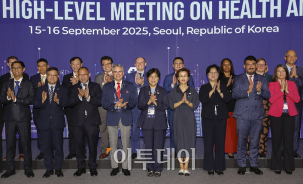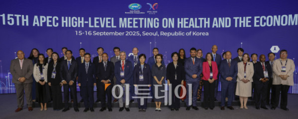 ▲정은경(앞줄 가운데) 보건복지부 장관 등 참석자들이 16일 서울 중구 신라호텔에서 열린 2025 APEC 보건과경제 고위급회의(HLMHE)에서 기념촬영을 하고 있다. 조현호 기자 hyunho@