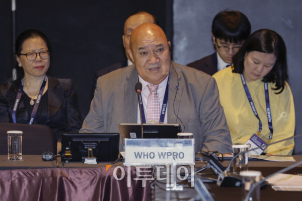 ▲사이아 마우 피우칼라 세계보건기구 서태평양지역사무소(WHO WPRO) 대표가 16일 서울 중구 신라호텔에서 열린 2025 APEC 보건과경제 고위급회의(HLMHE)에서 축사를 하고 있다. 조현호 기자 hyunho@