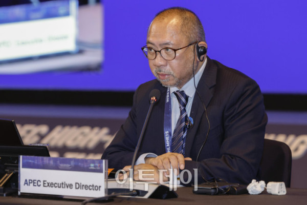 ▲에두아르도 페드로사 APEC 사무국장이 16일 서울 중구 신라호텔에서 열린 2025 APEC 보건과경제 고위급회의(HLMHE)에서 APEC25 우선순위를 발표하고 있다. 조현호 기자 hyunho@