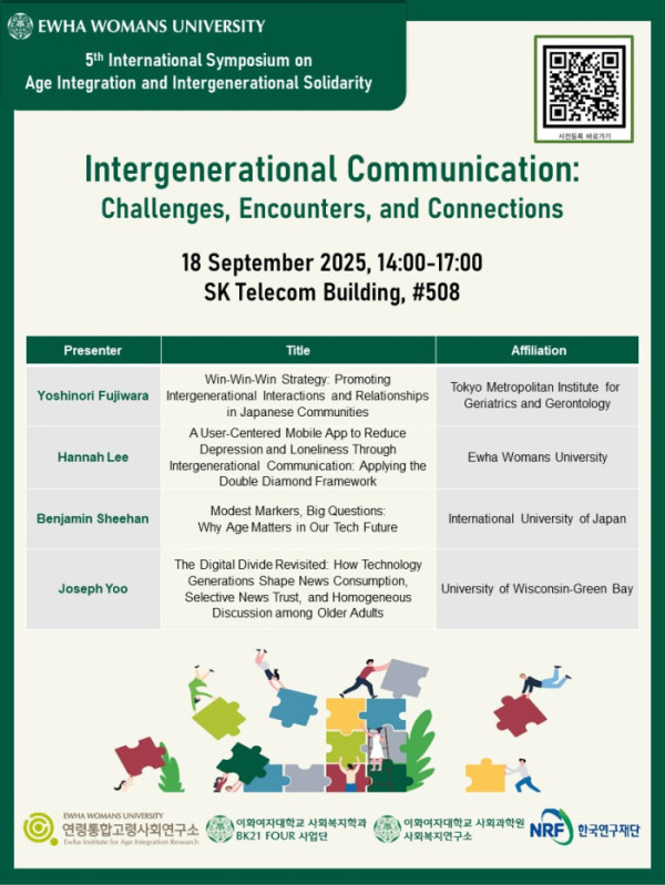 첫 번째 연사인 후지와라 요시노리 박사(일본 도쿄도 건강 장수 의료센터)는 ‘관계 촉진을 위한 전략’을 주제로 일본 지역사회에서 세대 간 상호작용을 촉진하는 전략과 사회적 의미를 발표한다. 이어 이하나 박사(이화여대 연령통합고령사회연구소)는 ‘세대 간 소통을 통한 모바일 앱 개발’을, 벤자민 시한 교수(일본 국제대학교)는 ‘기술 미래에서 연령이 왜 중요한가’를 주제로 기술 발전 속에서 연령의 의미를 소개한다.
