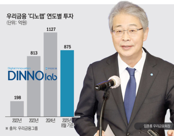 16일 금융권에 따르면 우리금융의 디노랩 누적 투자액은 8월 말 현재 3940억 원으로 집계됐다. 2016년 출범 이후 연평균 100억~200억 원 수준에 머물던 투자액은 2023년 임 회장 취임 후 단숨에 813억 원으로 치솟았다.