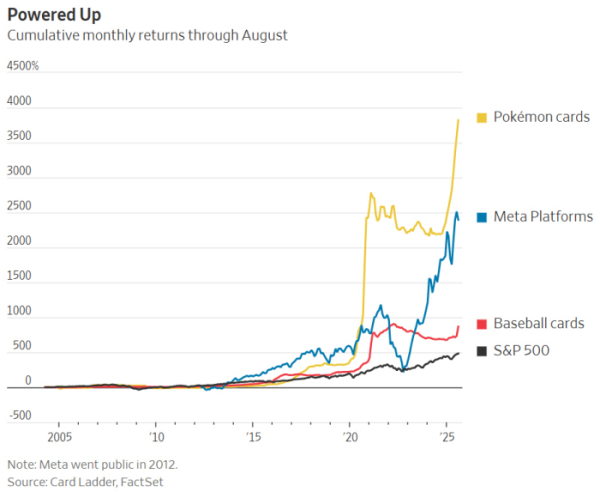 트레이딩카드는 배당도 없고 금융규제 대상도 아니지만 가격이 폭등하고 있다. 카드 가치 추적업체 카드라더지수에 따르면 8월까지 포켓몬 카드의 누적 월간 수익률은 2004년 이후 약 3821%에 달했다. 같은 기간 S&P500지수 수익률(483%)을 크게 웃도는 수치다. 매그니피센트7(M7)으로 불리는 미국 대형 빅테크 종목 중 하나인 메타의 2012년 상장 이후 주가 상승률은 약 1844%였다.