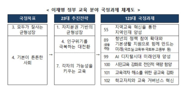 교육부는 이재명 정부의 123대 국정과제 중 ’지역교육 혁신을 통한 지역인재 양성‘, ’청년의 정책 참여 확대와 기본생활 지원으로 함께 만드는 미래‘, ‘AI 디지털 시대 미래 인재 양성’, ‘시민교육 강화로 전인적 역량 함양’, ‘교육격차 해소를 위한 공교육 강화’, ‘학교자치와 교육 거버넌스 혁신’ 등 총 6대 국정과제를 추진한다.
