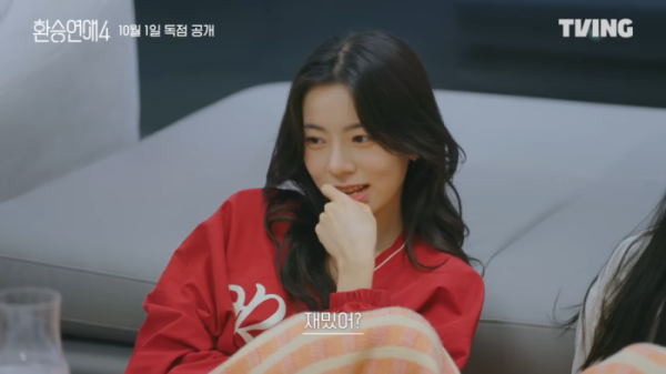 ▲티빙의 대표 연애 리얼리티 환승연애 시즌4가 다음 달 1일 독점 공개를 알리며 예고편의 한 장면이 송출되고 있다. (티빙 캡처)