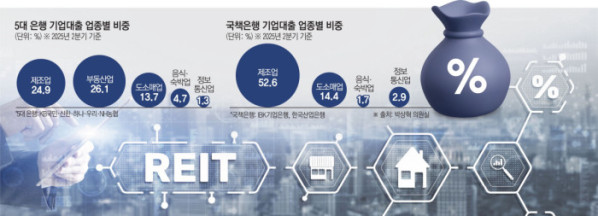 18일 박상혁 더불어민주당 의원실이 금융감독원으로부터 제출받은 자료에 따르면 5대 시중은행(KB국민·신한·하나·우리·NH농협)의 기업대출 잔액은 올해 2분기 기준 823조 원에 달한다. 업종별로 대기업이 많은 제조업이 205조 원으로 전체의 24.9%, 부동산업은 215조 원으로 26.1%를 각각 차지했다. 반면 음식·숙박업 39조 원(4.7%), 정보통신업은 11조 원(1.3%)에 그쳤다.