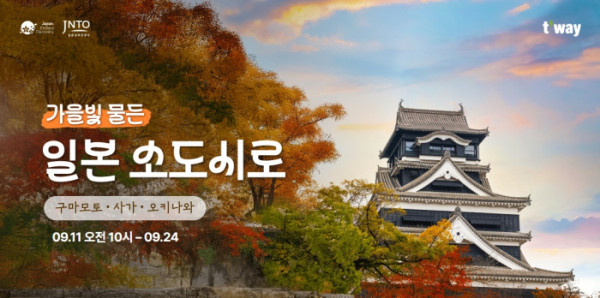 티웨이항공은 24일까지 JNTO(일본정부관광국)와 함께 ‘일본 소도시 항공권 프로모션’을 진행한다. 일본 소도시인 구마모토, 사가, 오키나와 노선을 대상으로 편도 및 왕복 모두 최대 15% 할인 혜택을 제공한다. 탑승 기간은 2026년 3월 28일까지다.