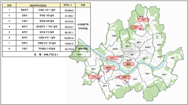 이번에 신규지정된 8곳 중 신통기획 후보지는 7곳으로 △영등포구 도림동 133-1일대(6만3654㎡) △강북구 미아동 159일대(3만7709.7㎡) △도봉구 방학동 638일대(3만9270.5㎡) △용산구 용산동2가 1-1351일대(4만3016.7㎡) △동작구 상도동 214일대(8만5787.7㎡) △동작구 사당동 419-1일대(13만3007.4㎡) △마포구 아현동 331-29일대(1만8557.3㎡)다. 공공재개발 구역은 구로구 가리봉동 2-92일대(2만5776㎡) 1곳이다.