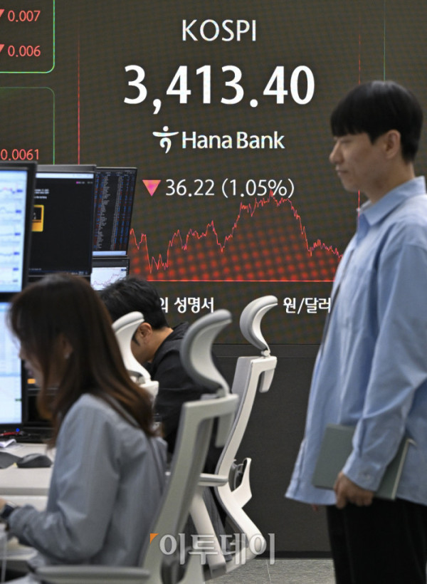 ▲코스피가 12거래일 만에 약세 전환하며 3410선에 하락 마감했다. 17일 서울 중구 하나은행 딜링룸 전광판에 코스피가 표시돼 있다. 이날 코스피 지수는 전 거래일보다 36.22(1.05%) 포인트 하락한 3413.40을 나타냈다. 코스피는 전날까지 11거래일 연속 상승, 5거래일 연속 사상 최고가를 경신했다. 조현호 기자 hyunho@
