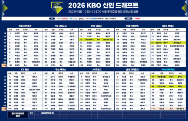 2026 KBO 리그 신인 드래프트가 17일 서울 롯데호텔월드 크리스탈볼룸에서 열렸다. 올해 지명 대상자는 고교 졸업 예정자 930명, 대학 졸업 예정자 261명, 얼리 드래프트 신청자 51명, 해외 및 기타 선수 19명 등 총 1261명으로 집계됐다. 구단별 트레이드 결과에 따라 키움과 NC가 13명, 한화와 SSG가 10명, KIA가 9명을 각각 지명했다.