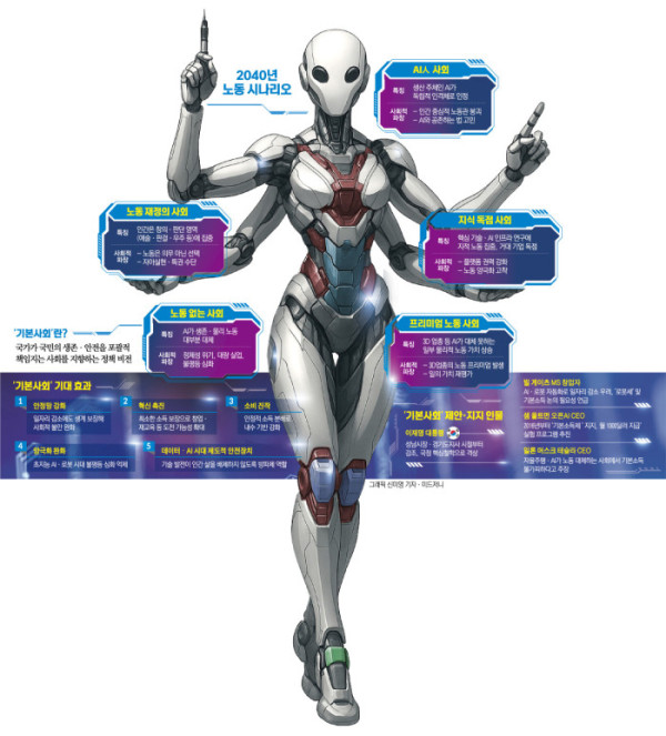직장에서는 인간과 디지털 복제인간, AI 에이전트들이 나란히 앉아 회의를 한다. 양자컴퓨터는 이미 수십 가지 결론을 연산해 놓고 인간이 토론을 시작하기도 전에 최종안을 제시한다. 인간은 토론자가 아니라 검증자가 된다. 하지만 이런 회의 자리에 참석할 수 있는 건 극소수다. 자동화와 기본소득이 일상이 된 사회에서 일할 수 있는 권리 자체가 소수 특권층의 전유물이 됐기 때문이다. 초지능 AI와 결합해 지적 능력을 확장한 새로운 엘리트 계층이 등장했지만 반대로 사회적 소외를 겪는 사람들도 늘어나 양극화가 심화되고 있다. 노동은 더 이상 생존의 조건이 아니라 신분과 지위를 증명하는 상징으로 바뀌고 있다.