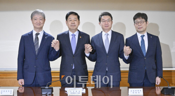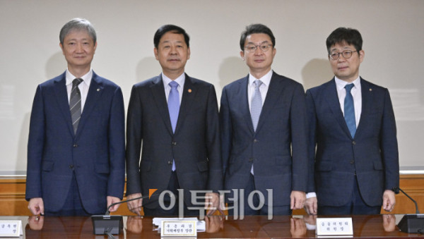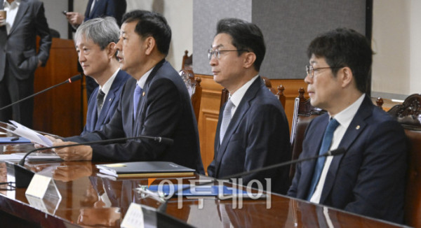 ▲구윤철(왼쪽 두 번째) 경제부총리 겸 기획재정부 장관과 이억원(왼쪽 세 번째) 금융위원회 위원장, 이찬진(왼쪽) 금융감독원장, 유상대 한국은행 부총재가 18일 서울 중구 은행회관에서 열린 확대 거시경제금융회의에 앞서 기념촬영을 하고 있다. 이날 회의에 이창용 한국은행 총재는 미국 워싱턴 D.C에서 열린 IMF의 미셸 캉드쉬 중앙은행 강연과 크리스탈리나 게오르기에바 총재와 대담 등 일정과 겹쳐 화상으로 참여했다. 조현호 기자 hyunho@