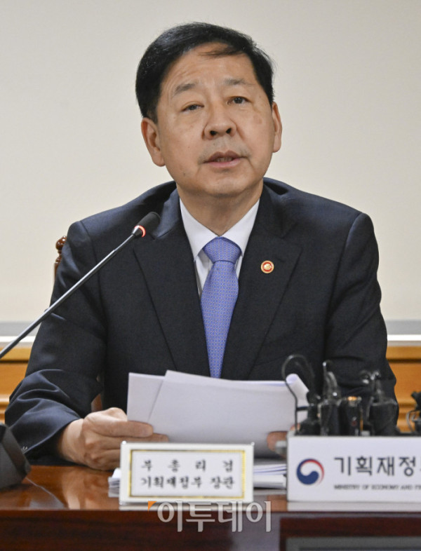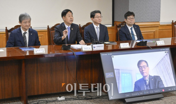 ▲구윤철 경제부총리 겸 기획재정부 장관이 18일 서울 중구 은행회관에서 열린 확대 거시경제금융회의에서 모두발언을 하고 있다. 이날 회의에 이창용 한국은행 총재는 미국 워싱턴 D.C에서 열린 IMF의 미셸 캉드쉬 중앙은행 강연과 크리스탈리나 게오르기에바 총재와 대담 등 일정과 겹쳐 화상으로 참여했다. 조현호 기자 hyunho@