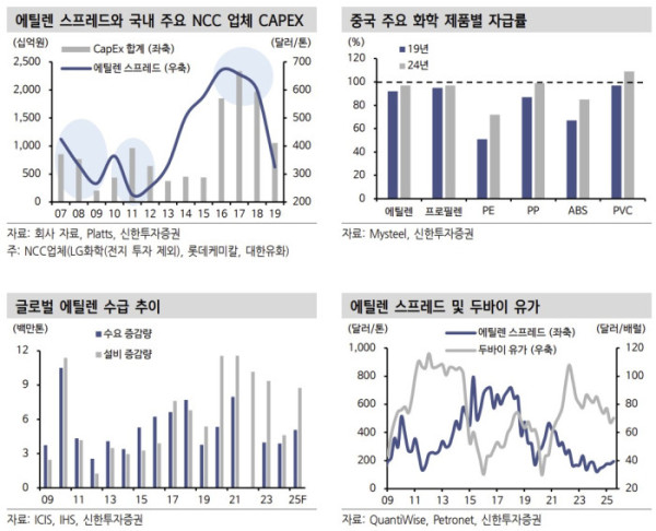 이진명 신한투자증권 연구원은 "유럽과 일본을 중심으로 진행 중인 설비 구조조정이 한국과 중국으로 확산되고 있다"며 화학 업황 반등 조건으로 공급 축소를 강조했다. 글로벌 에틸렌 설비는 2028년까지 3997만 톤(연평균 증가율 4.1%)이 증설될 전망이지만, 수요 증가는 2483만 톤(3.1%)에 그칠 것으로 보인다.